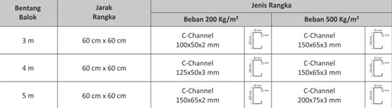 Kekuatan Nusafloor dalam menahan beban tetap sangat bergantung pada presisi rangka penyangga. Penggunaan rangka besi CNP, UNP atau rangka besi hollow dengan spesifikasi yang tepat sangat menentukan apakah panel dapat berfungsi maksimal tanpa retak.